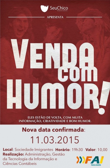 Os cursos de Administração, Ciências Contábeis e Gestão da Tecnologia da Informação estão programando a apresentação teatral do Seu Chico \"Venda com humor\" para a próxima semana, quarta-feira. Conforme a coordenadora do curso de Administração, Rosiane Oswald Flach, inicialmente o teatro estava previsto para hoje, porém em função dos transtornos causados pelas paralisações e cancelamento das aulas nos últimos dias, foi agendada nova data (11/03/2015).