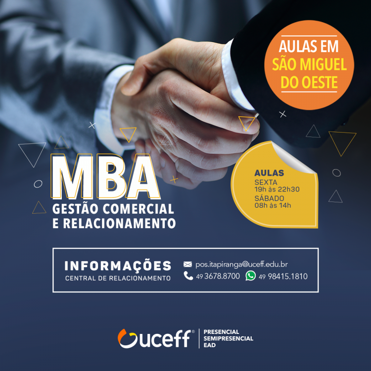 A UCEFF abriu nesta semana as inscrições para nova turma do curso de pós-graduação MBA Gestão Comercial e Relacionamento. Conforme o coordenadora, professora Nathalia Berger Werlang, o objetivo deste curso é desenvolver profissionais que atuam na área comercial para gerenciar os recursos organizacionais de maneira mais eficiente, adaptar objetivos da empresa às necessidades e oportunidades do mercado competitivo, além de apresentar as melhores práticas de gestão comercial no que se refere a gestão de clientes, expansão comercial, marketing, distribuição e gestão estratégica, para assim aumentar as vendas e melhorar o desempenho organizacional.