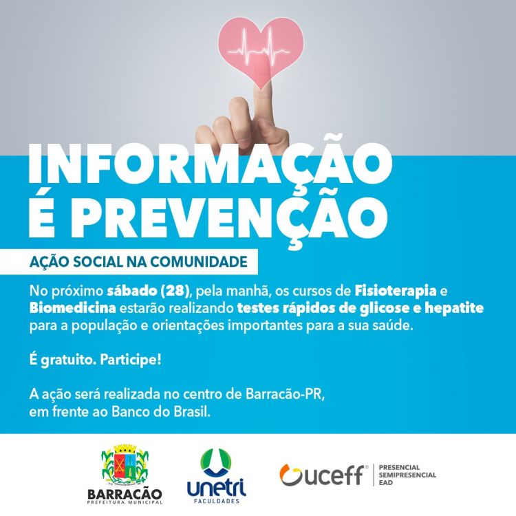 Os cursos de Biomedicina e de Fisioterapia vão realizar, no próximo sábado, 28 de agosto, um pedágio de informações, orientações e prevenção em saúde, além da realização de testes rápidos. Durante a atividade, todos os serviços serão ofertados gratuitamente a população. O evento será na Avenida 7 de Setembro, em frente a agência do Banco do Brasil, no centro de Barracão-PR, das 8h30 às 11h30.