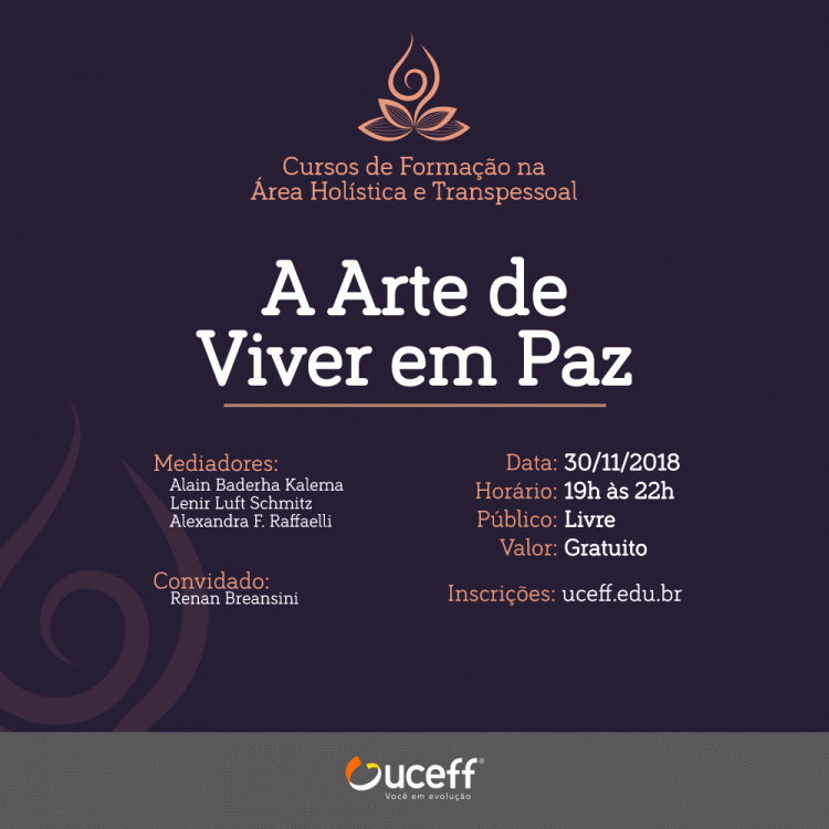 Com o objetivo de possibilitar o desenvolvimento holístico e transpessoal a UCEFF Itapiranga oferece o curso de extensão "A arte de viver em paz". Conforme o coordenador de extensão, professor Kurlan Frey, o primeiro evento será no dia 30 de novembro, das 19 às 22h, com os mediadores Alain Baderha Kalema, Lenir Luft Schmitz e Alexandra Raffaelli, além do convidado Renan Breansini.