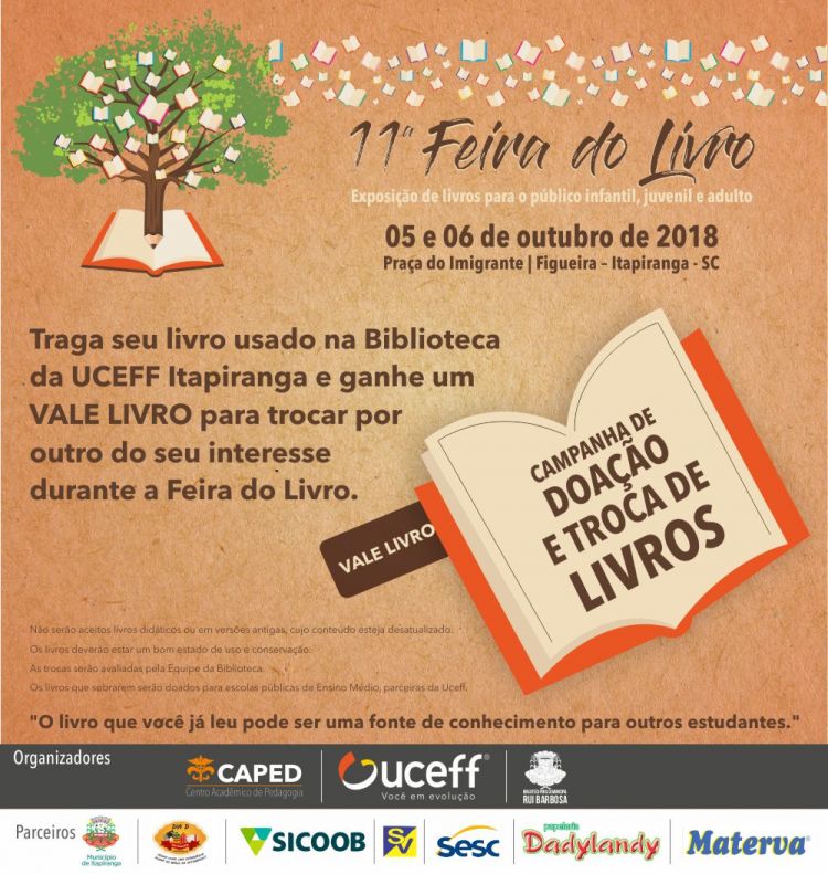 "Traga seu livro usado na Biblioteca da UCEFF Itapiranga e ganhe um Vale Livro para trocar por outro do seu interesse durante a 11ª Feira do Livro ou no período de 15 a 19 de outubro na própria Biblioteca da Instituição", explica a bibliotecária Marli Biesdorf.