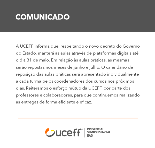A UCEFF informa que, respeitando o novo decreto do Governo do Estado, manterá as aulas através de plataformas digitais até o dia 31 de maio.