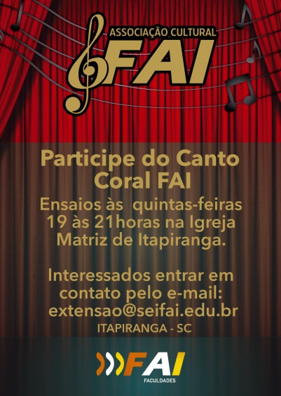 A Associação Cultural FAI está com inscrições abertas para novos integrantes cantores do Coral. Os ensaios acontecem nas quintas-feiras a noite na Igreja Matriz.