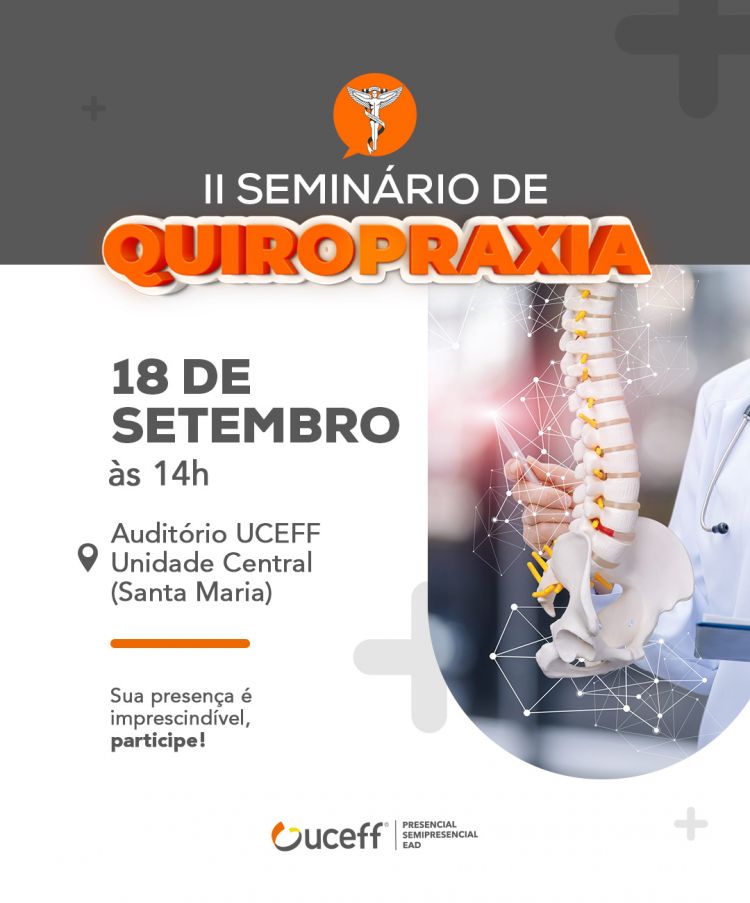 O curso de Quiropraxia realiza no dia 18 de setembro, Dia do Quiropraxista, o II Seminário de Quiropraxia da UCEFF. O evento gratuito será realizado a partir das 14h no auditório da Unidade Santa Maria e é voltado para os acadêmicos do curso.
