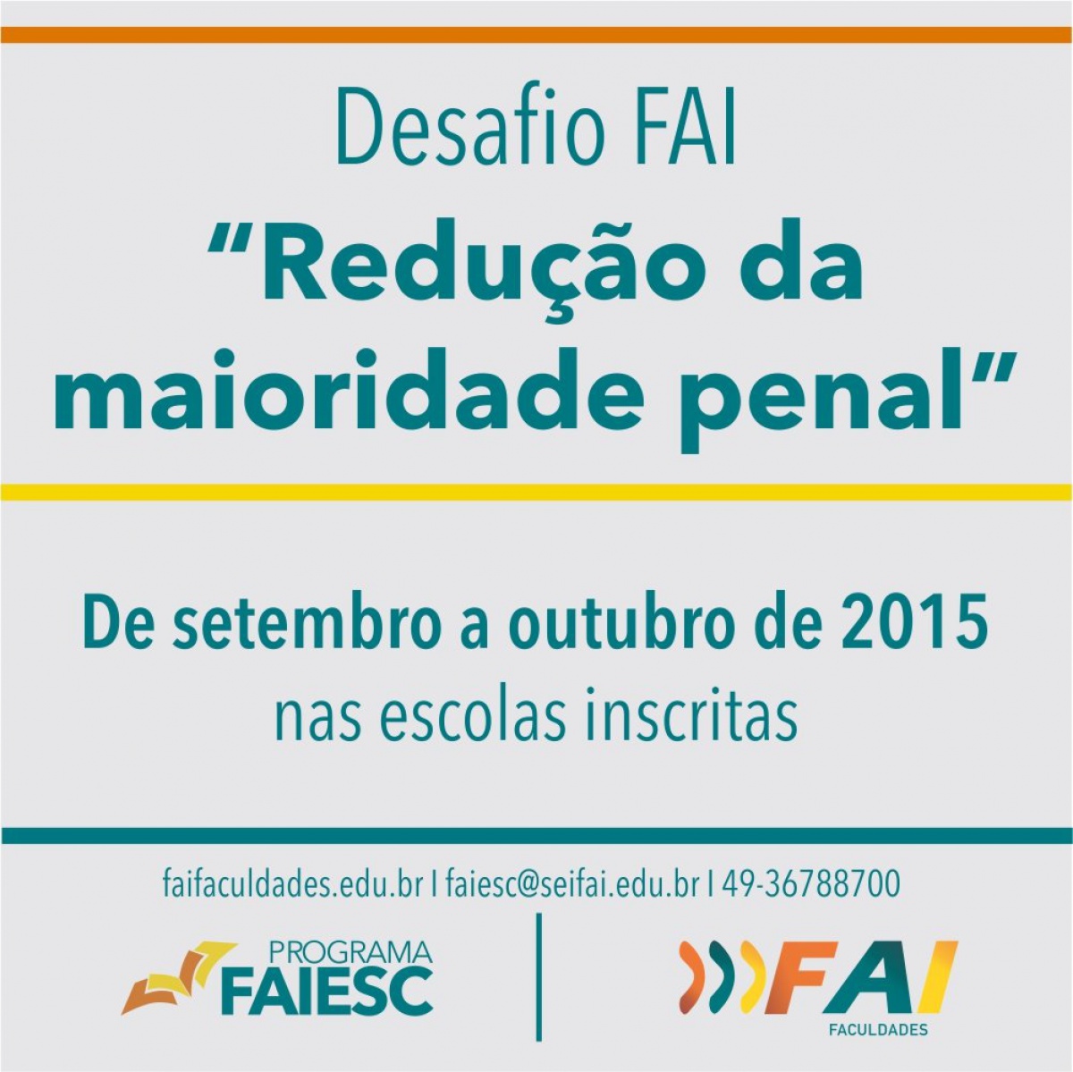 Nesta semana a FAI Faculdades definiu o tema da redação do Desafio FAI 2015. Conforme o professor Jair Turcatto, durante os meses de setembro e outubro os alunos concluintes do Ensino Médio terão a oportunidade de desafiar seus conhecimentos escrevendo uma redação sobre \"Redução da maioridade penal\". A redação será desenvolvida na presença de um colaborador da Instituição. O agendamento com as Escolas inscritas inicia na próxima semana.