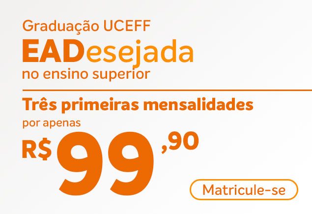 A sua graduação é 100% online com a qualidade UCEFF. O EAD agora é Destaque, Desejado e Diferente. E você pode ter tudo isso com parcelas de R$ 99,90 nas três primeiras mensalidades. Não perca tempo e faça já sua inscrição. Em caso de dúvida chame nossa equipe pelo WhatsApp (49) 3319-3800.