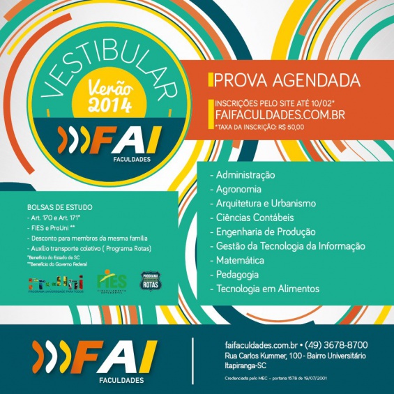A FAI Faculdades de Itapiranga está com inscrições abertas para a 2ª edição do Vestibular de Verão. Conforme o presidente, Leandro Sorgato, esta é uma oportunidade para aqueles que perderam o primeiro processo seletivo realizado em dezembro e que ainda tem a intenção de continuar seus estudos. \"Estamos oferecendo vagas para alguns cursos a fim de reforçar as turmas abertas ou segundas turmas\", explica Sorgato.