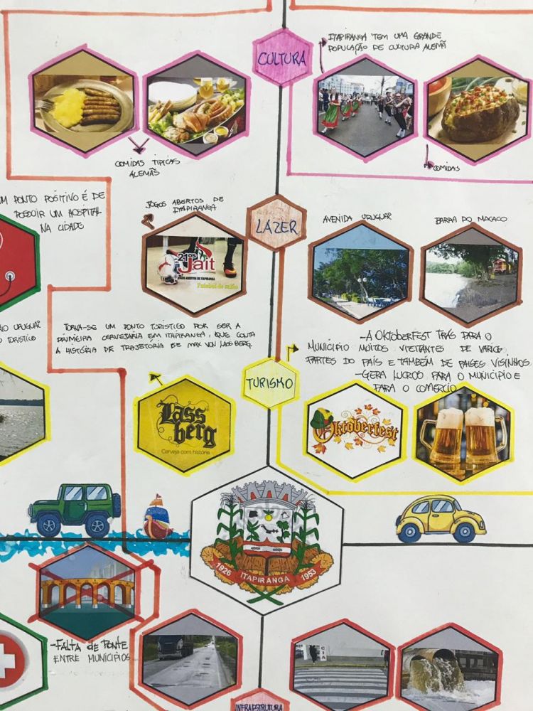 A diferença no trabalho aconteceu na forma de expor esses dados coletados, ao invés das tradicionais tabelas, onde os alunos utilizam largamente o copia e cola sem entender os dados ou conseguir analisar os resultados, sua apresentação e exposição foi através de um mapa mental, desenvolvido pelas equipes, de forma lúdica e criativa, que trouxe resultados muito positivos para a compreensão dos problemas levantados.