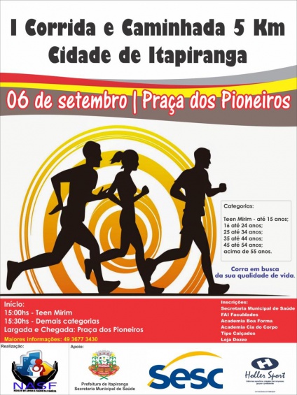 A secretaria municipal de Saúde de Itapiranga, através do Núcleo de Apoio a Saúde de Família NASF estará promovendo o evento para mostrar à comunidade itapiranguense alguns benefícios da prática regular de atividades físicas. A 1ª Corrida e Caminhada 5 Km Cidade de Itapiranga acontecerá no dia 06/09, a partir das 15hs na Praça dos Pioneiros, na entrada da cidade. O percurso da corrida será de 5 km e 3 km de caminhada. As atividades serão orientadas por profissionais da área. O evento conta com o apoio da Prefeitura de Itapiranga, SESC e Holler Sport.