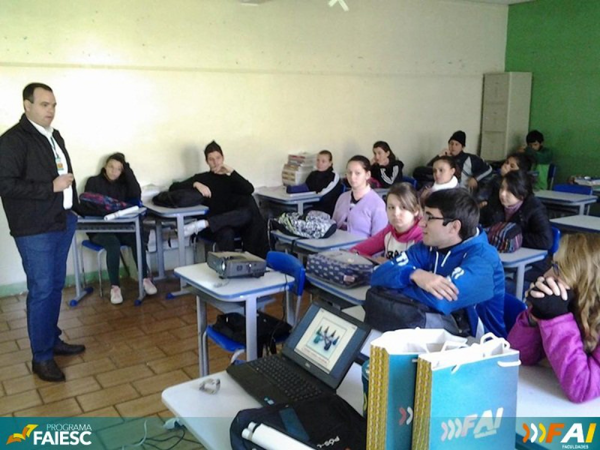 Nesta semana tiveram início as palestras nas escolas da região promovidas pelo Programa Faiesc - FAI na Escola. A primeira escola a receber o Programa Faiesc 2014 foi a Genoveva Dalla Costa de Riqueza - SC. Os articuladores de graduação professores Jair Turcatto e Rafael Engel palestraram para três turmas concluintes do Ensino Médio, nos turnos matutino, vespertino e noturno, sobre a temática \"Ser ou não ser: uma questão de escolha\".